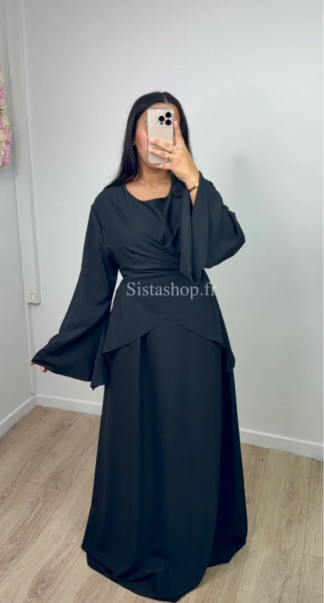 Abaya Jasmine, un modèle unique au design structuré. Sa coupe fluide est sublimée par un effet portefeuille et un jeu d’asymétrie au niveau de la taille, créant une silhouette élégante et harmonieuse. Ses manches évasées ajoutent une touche de raffinement et de mouvement pour un rendu à la fois chic et intemporel.