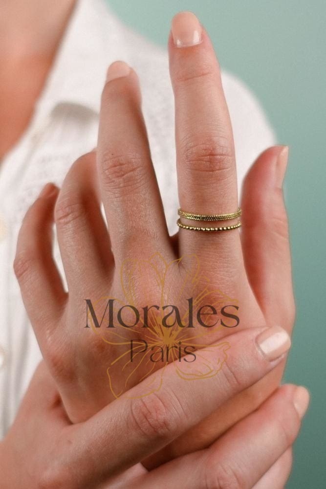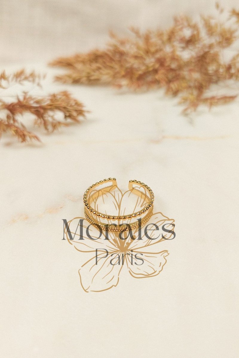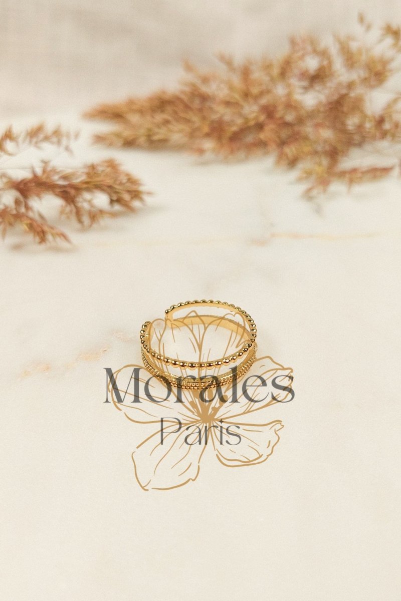 Une jonc ajustable deux rangs en acier inoxydable dorée, elle comprend un premier anneau avec un effet billes et un second avec une rainure. Cette bague discrète et élégante conférera une note bohème chic à votre look. Pour un style bohème total, on la porte en accumulation avec d’autres bagues dorées.
