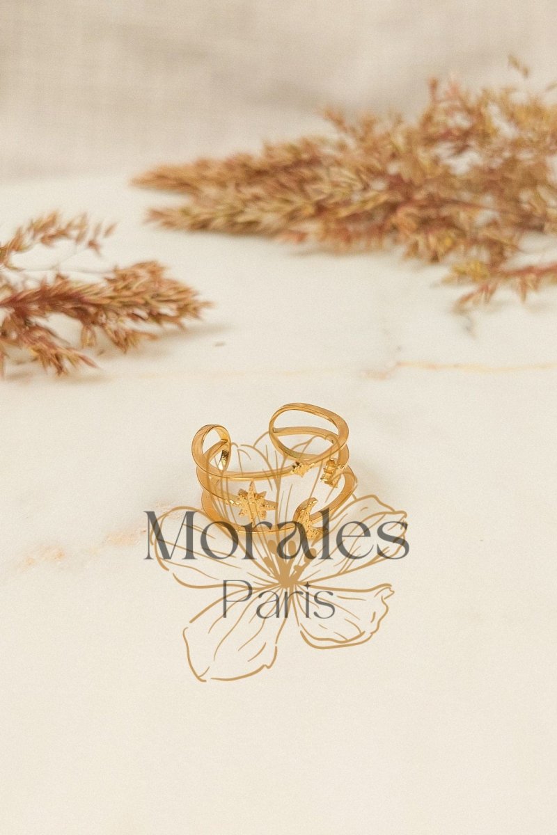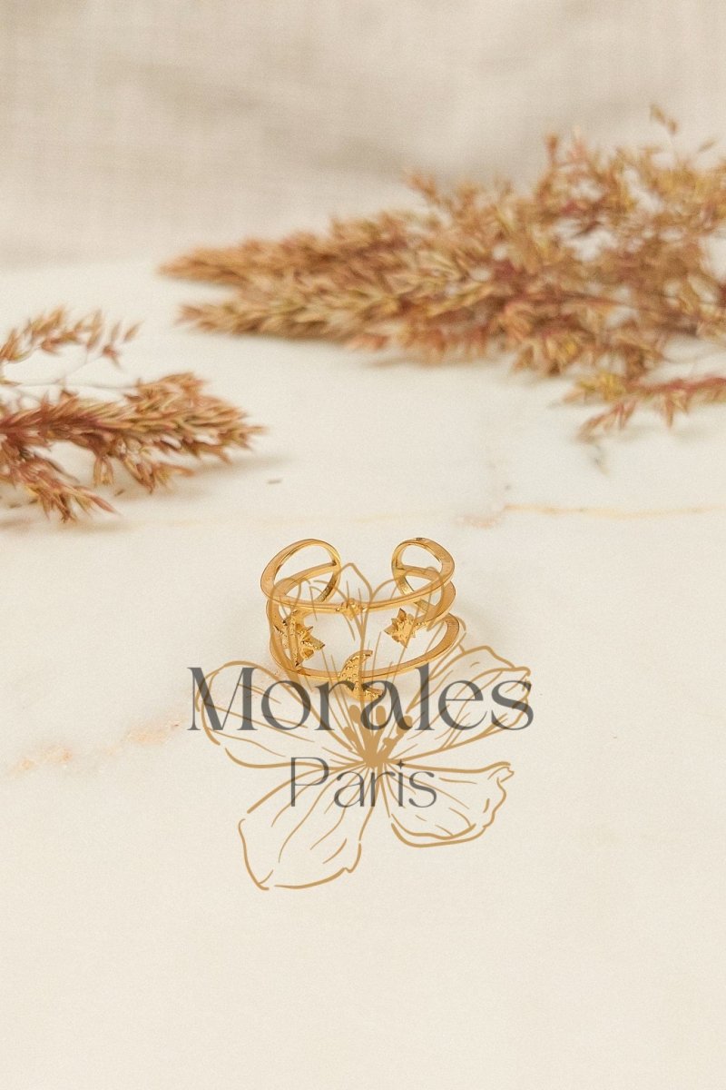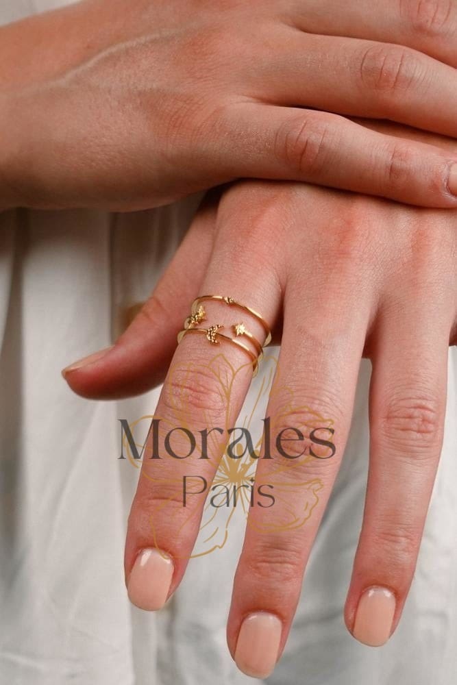 Sublime bijou minimaliste qui offre un magnifique ciel étoilé autour du doigt. Composée de trois rangs ornés d’une lune et d’étoiles, cette bague fantaisie bohème est ajustable et empreinte d’un univers fascinant.