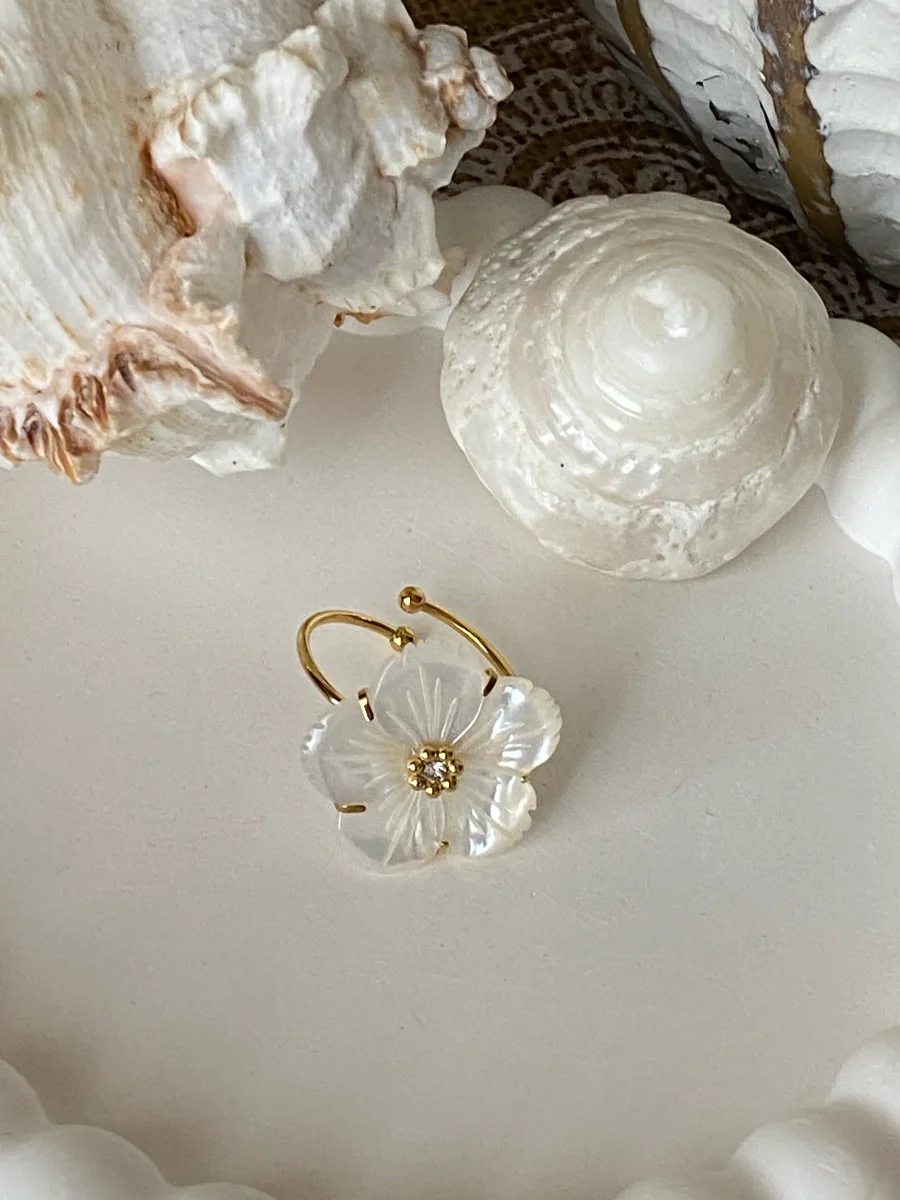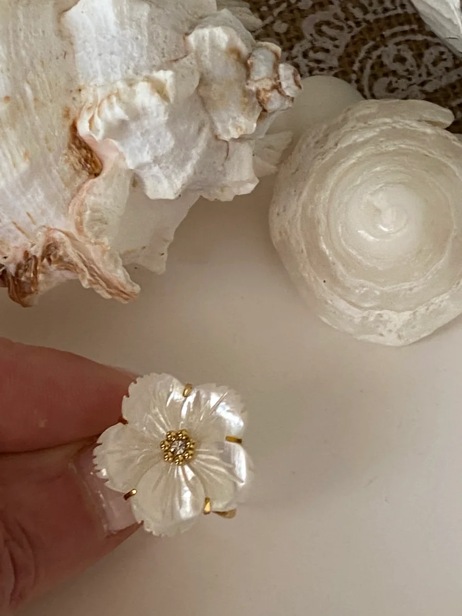 Bague avec fleur sculptée en nacre , réhaussée d’ un coeur doré serti d’ un petit cristal , Très jolie cet ete sur une peau bronzée