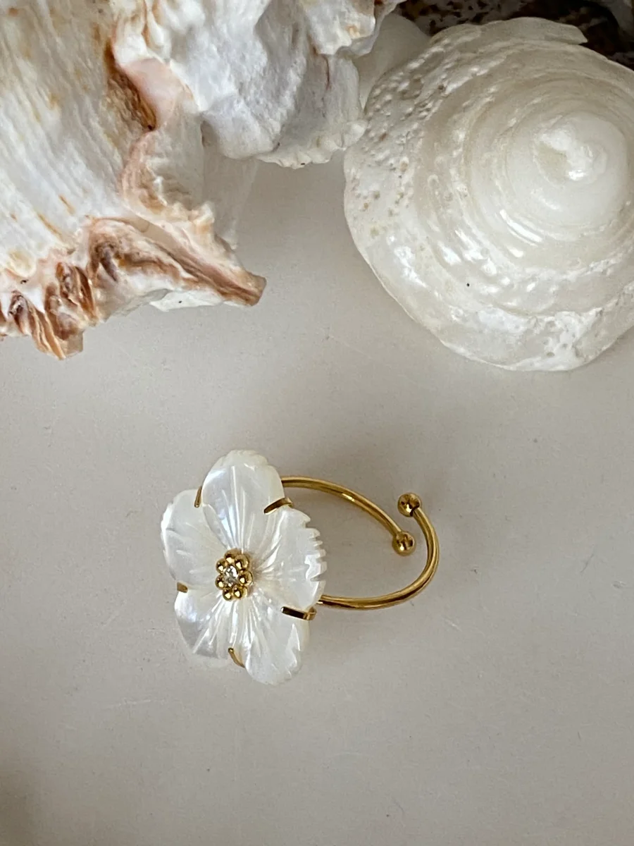 Bague avec fleur sculptée en nacre , réhaussée d’ un coeur doré serti d’ un petit cristal , Très jolie cet ete sur une peau bronzée bague ajustable en acier inoxydable , dimension fleur 2×2 cm NOUVELLE COLLECTION PRINTEMPS ETE résiste à l’eau Peuvent etre assorties avec les bo