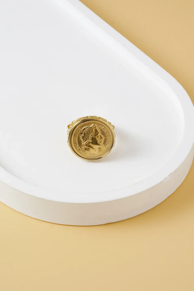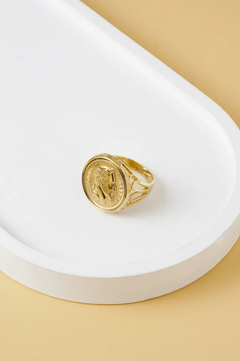 Cette bague dorée en acier inoxydable allie robustesse et élégance, sublimée par un médaillon romain en relief. Son design inspiré de l’empire romain évoque puissance et héritage historique, faisant de cet accessoire un choix parfait pour un style à la fois sophistiqué et affirmé. Durable et raffinée, elle apporte une touche distinctive à toute tenue masculine.