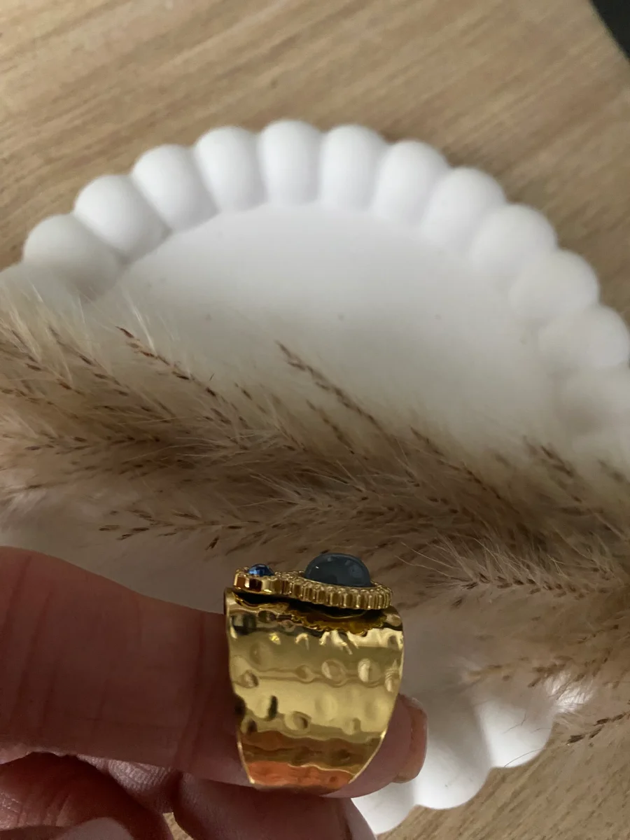 Bague grand effet martelé en acier inoxydable composée d’un cabochon ovale en acétate et d’un cristal taillé rond sur un assemblage aux contours effet perlés Ajustable de la taille 52 à 58 anneau d’écouteur 20 mm Cabochon 6 x 8 mm cristal 4X4 mm Résiste à l’eau