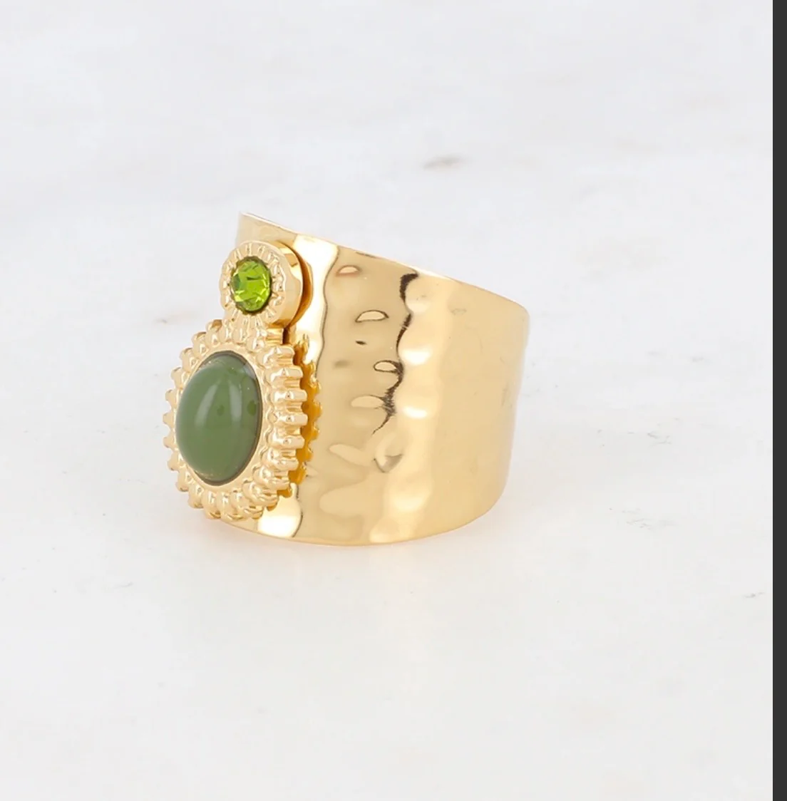 Bague grand effet martelé en acier inoxydable composée d’un cabochon ovale en acétate et d’un cristal taillé rond sur un assemblage aux contours effet perlés Ajustable de la taille 52 à 58 anneau d’écouteur 20 mm Cabochon 6 x 8 mm cristal 4X4 mm Résiste à l’eau
