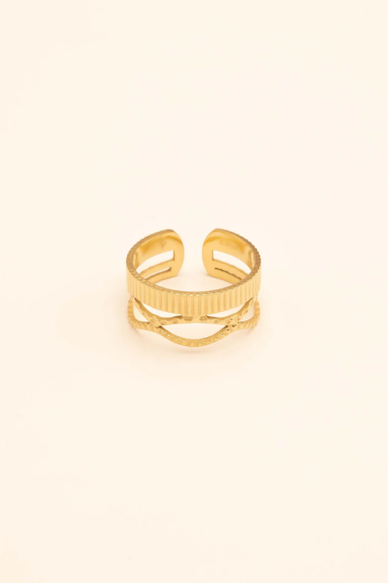 Bague en acier inoxydable composée de lignes ondulées texturées et d’une anneau strié.Ajustable, la bague se resserre ou s’agrandit : de la taille 52 à 56Hauteur de la bague: 9 mm Garantie sans nickel, sans cadmium, sans sel de plomb.Résiste à l’eau et ne noircit pas. Infos produit Composition: Acier inoxydable : 100% Référence: BS1179J0380