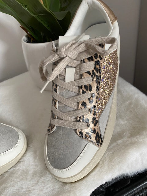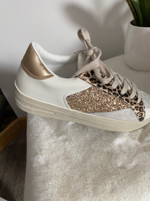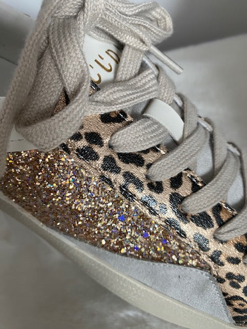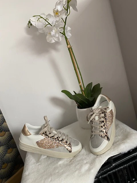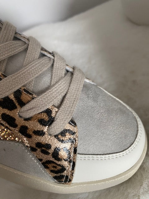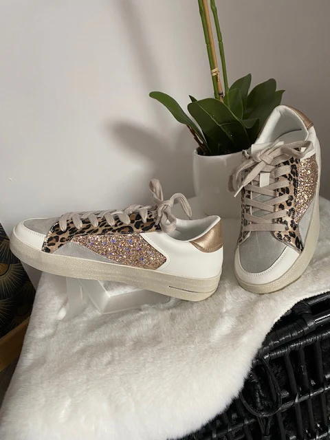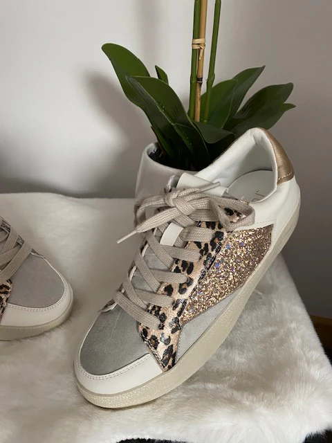 Baskets blanches à lacets , avec motif léopard et daim gris clair et sequins roses gold