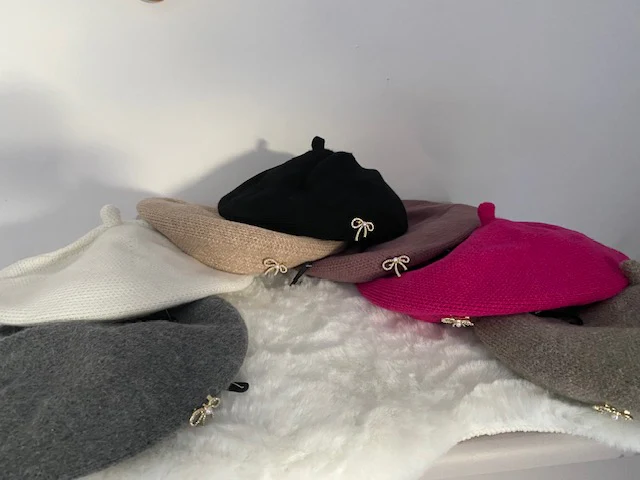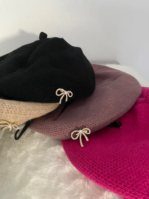 Beret réglable avec une broche strassée en forme de noeud et une perle Taille unique Composition: ANGORA 10% VISCOSE 30% NYLON 60% 6 COULEURS : NOIR , TAUPE, GRIS, BLANC , FUSHIA ,VIEUX ROSE