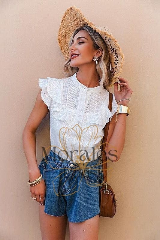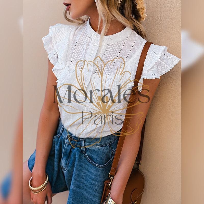 Ne ratez pas cette blouse blanche glamour pour être au goût du jour cet été. Elle s’allie parfaitement à un bermuda en jean et à des chapeaux de style capeline. La dentelle délicate donne à cette blouse une allure très chic. De plus, les petits volants lui confèrent une aération subtile, ce qui en fait un classique intemporel.
