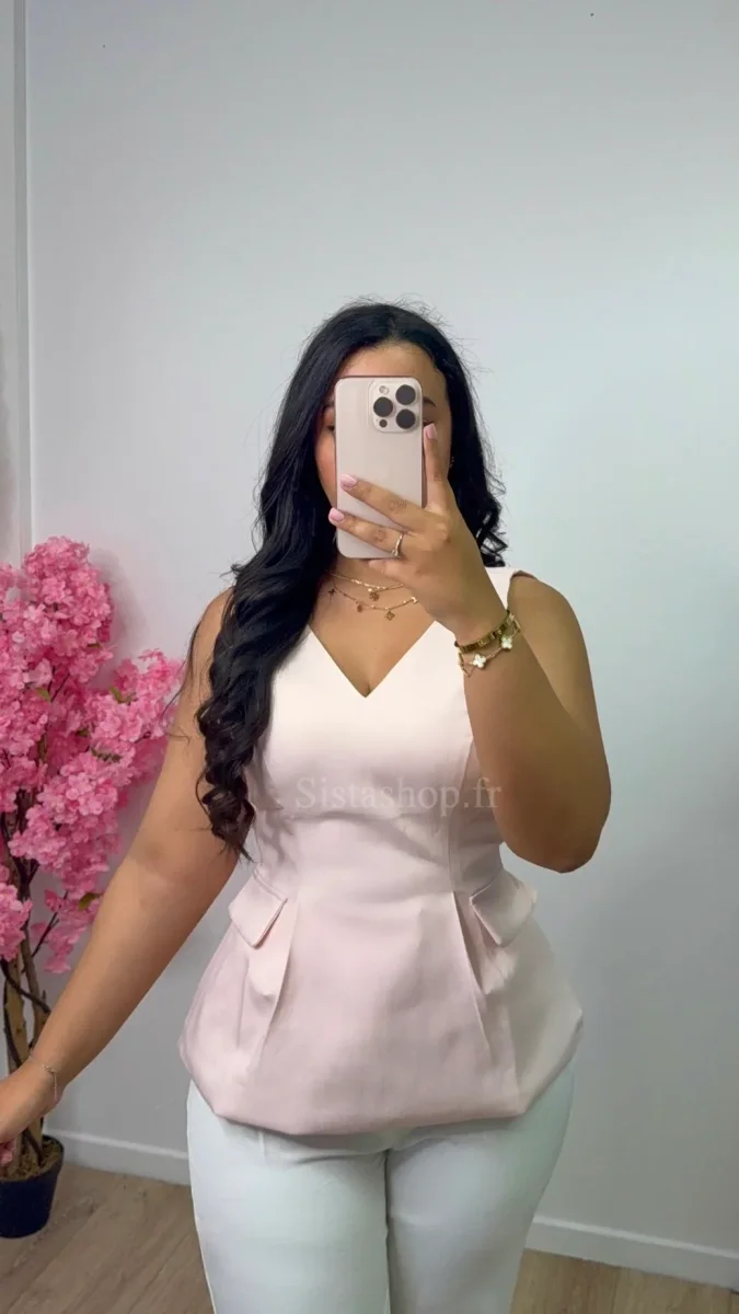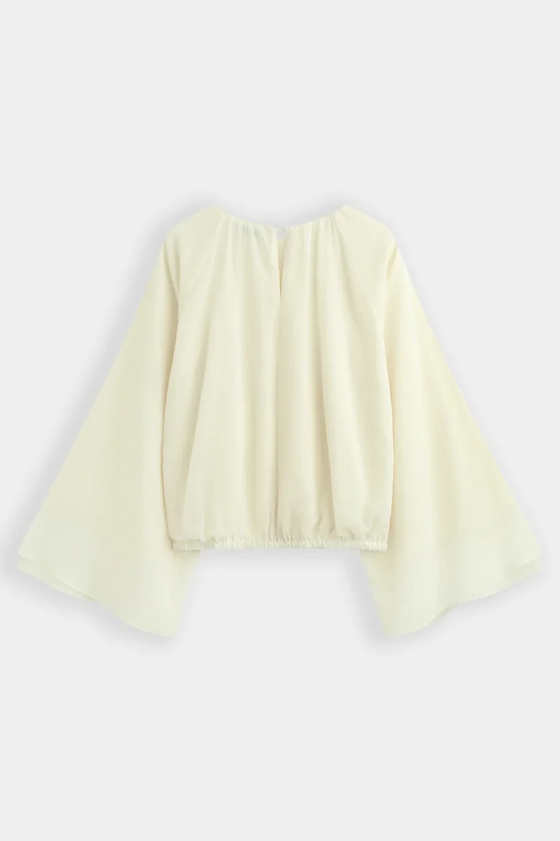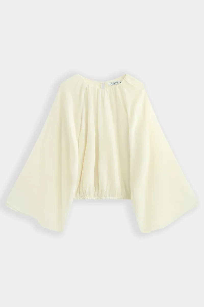 Blouse à encolure ronde avec fronces régulières au col. Manches larges type kimono. Bas resserré par élastique intégré. Fermeture au dos par bouton discret avec fente centrale.