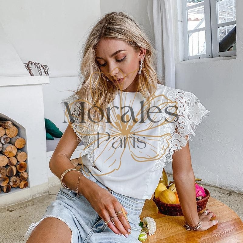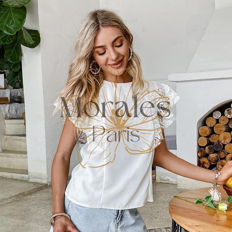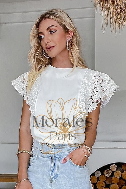 Cette blouse de style Bohème est ravissante et offre un effet trapèze grâce à ses manches en dentelle. Son aspect satiné lui donne un look très élégant. Elle peut être portée à la fois de façon décontractée avec un jeans ou plus formel avec une jupe droite.