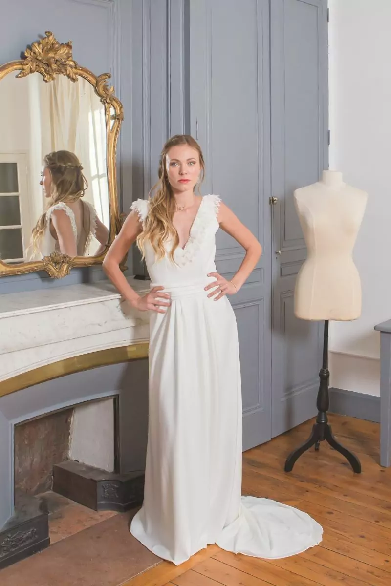 Body de mariée romantique et élégant.Top sans manche col V en crêpe oekotex et dos nu en dentelle de Calais.À porte avec une jupe longue ou courte.Ne convient pas aux fortes poitrines et aux bustes longs. Taille : 36/38Une seule pièce disponible. Pourquoi on l’aime ? Pour son dos nu carré aux motifs façon écailles.