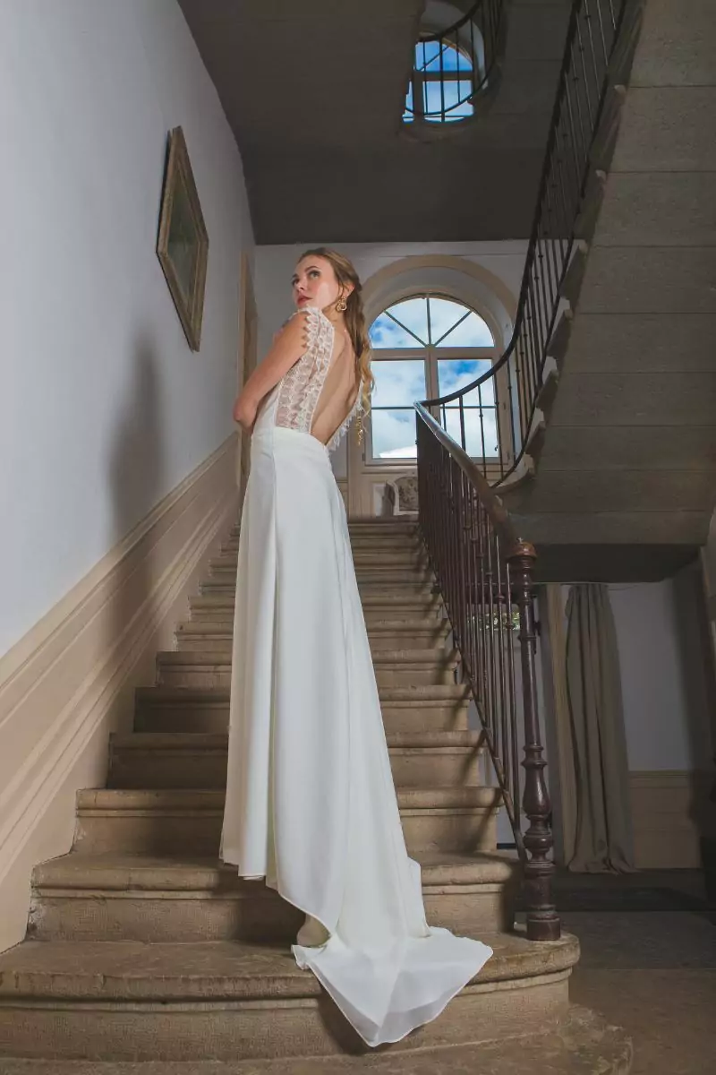 Top sans manche col V en crêpe oekotex et dos nu en dentelle de Calais.