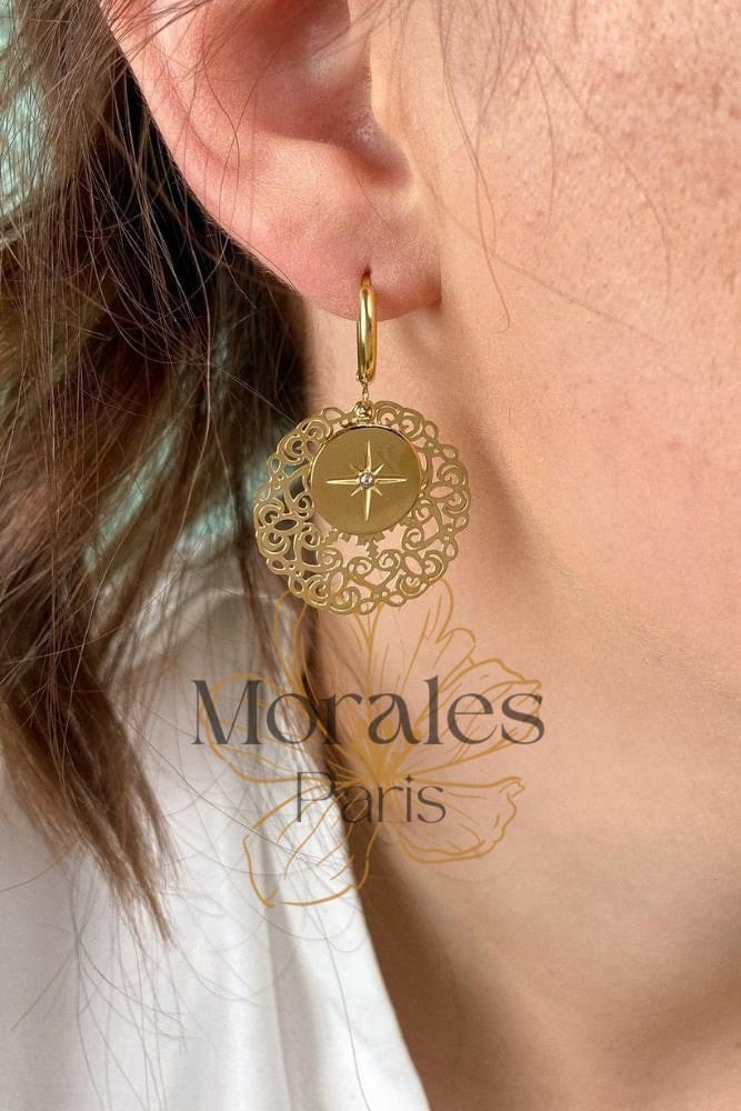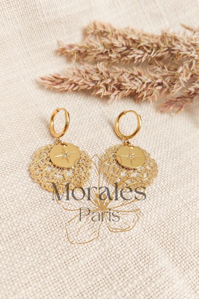 Complétez votre look avec ces boucles d’oreilles bohèmes élégantes. Ces créoles sont ornées de deux pendentifs : une rosette et un strass en forme d’étoile. Fabriquées en acier inoxydable doré, ces pièces sont résistantes à l’eau et à l’odeur.