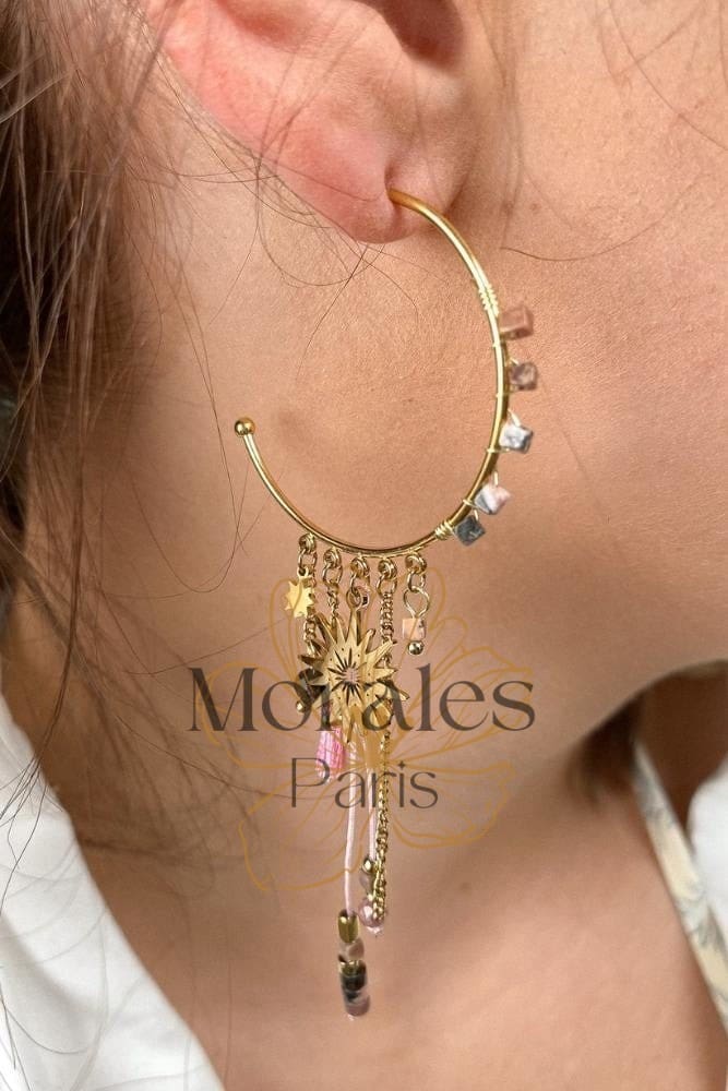 Ajoutez une touche de fantaisie à votre look avec ces magnifiques boucles d’oreilles bohèmes hippies ! De type créole à puce, elles sont ornées de petites pierres naturelles, de perles colorées et d’un pendentif en forme de soleil. Un bijou qui exprime la joie et le sentiment de liberté.