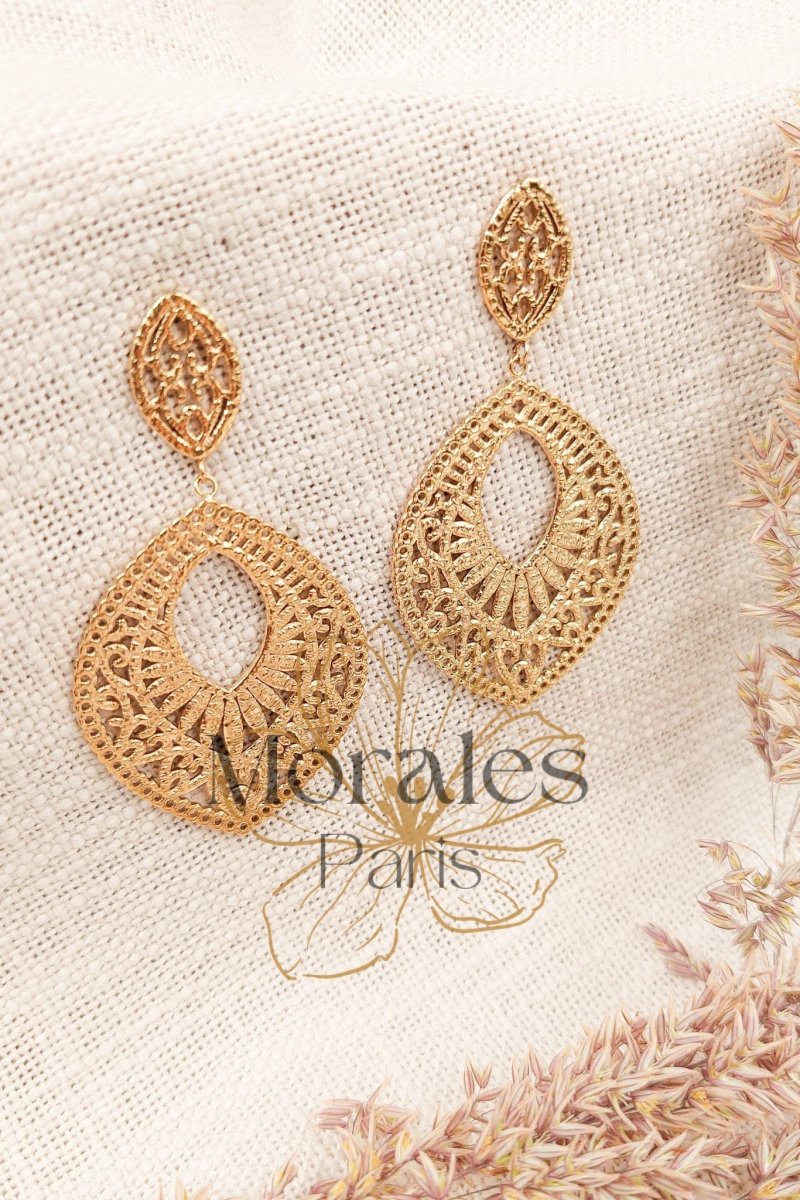 Offrez à votre visage un éclat supplémentaire avec ces ravissantes boucles d’oreilles bohème. D’une couleur dorée, elles captent la lumière et ne sont pas passées inaperçues. Avec leur forme pendantes et ajourées, elles apportent un look rétro-ethnique.