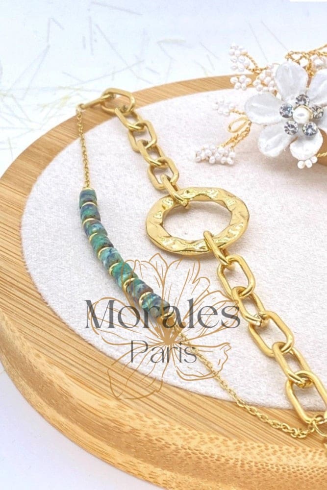 Donnez du style à votre look et laissez entrevoir votre audace bohème avec ce bracelet en acier inoxydable. On adore sa chaîne en mailles volumineuses, sa pièce ronde martelée et sa fine chaînette ornée de perles vertes.