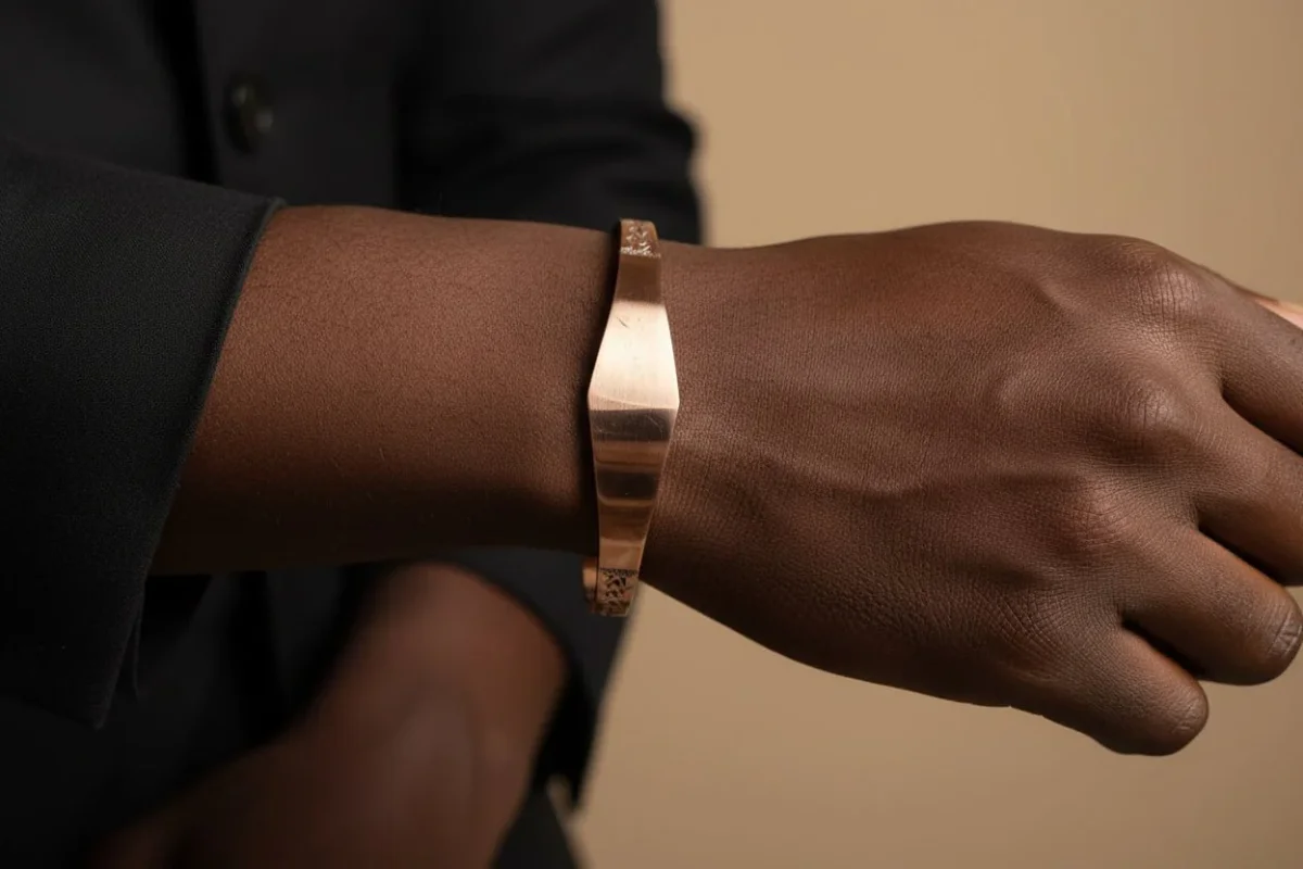 Le cuivre est l’un des métaux les plus anciennement travaillés sur le continent. Les travaux de Kalala Omotunde sur les civilisations africaines anciennes documentent son usage dans l’Égypte antique et dans des traditions multicentenaires d’Afrique subsaharienne : porté au contact de la peau, au poignet, au cou, aux chevilles, dans une logique de soin et de protection inscrite dans des pratiques de parure anciennes et documentées.