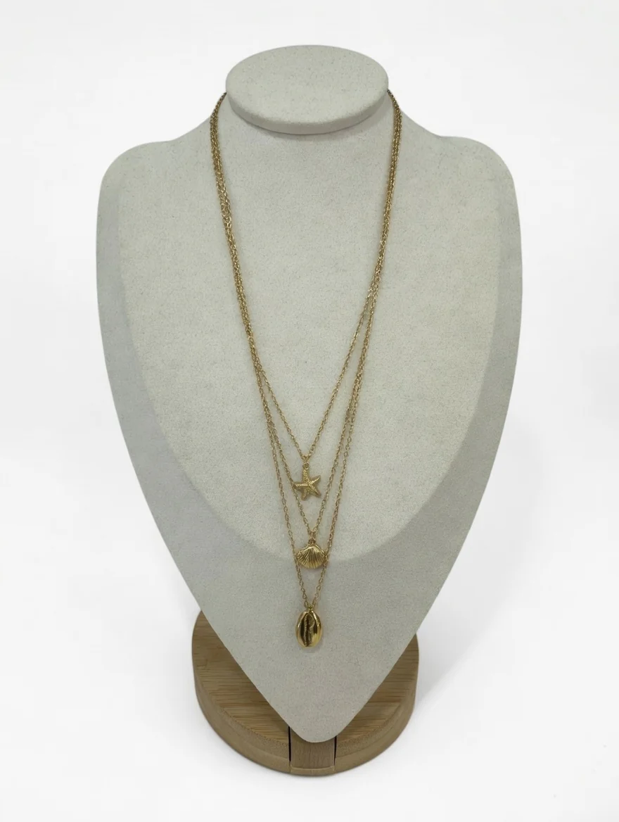 Collier délicat à trois rangs mêlant les trésors de la mer. Composé d’un cori, d’un coquillage et d’une étoile de mer, ce bijou capture l’essence balnéaire avec élégance. Chaîne fine et délicate, parfait pour un style bohème et intemporel. À porter seul ou superposé pour plus de caractère.