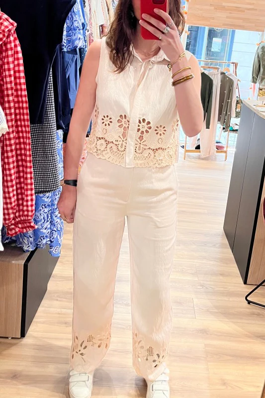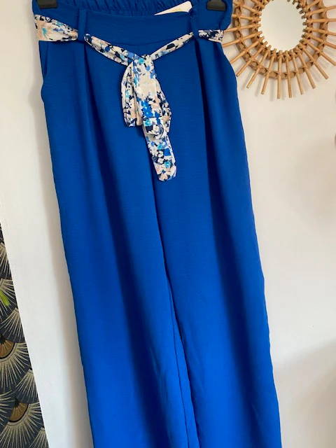 Ensemble composé d’ un pantalon taille élastique et d’ un top sans manches avec épaulettes et ceinture peu etre ceinturé devant ou dans le dos ,très fluide .
