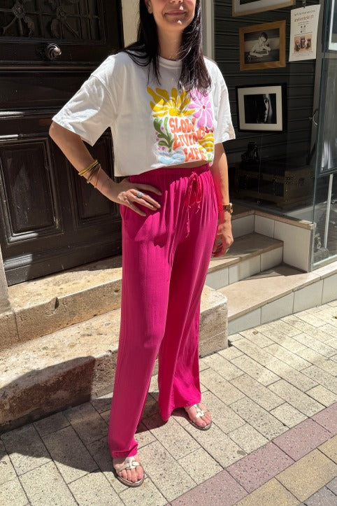 Ensemble composé d’ un pantalon taille élastique et d’ un top sans manches avec épaulettes et ceinture ,très fluide et léger. Coupe palazzo