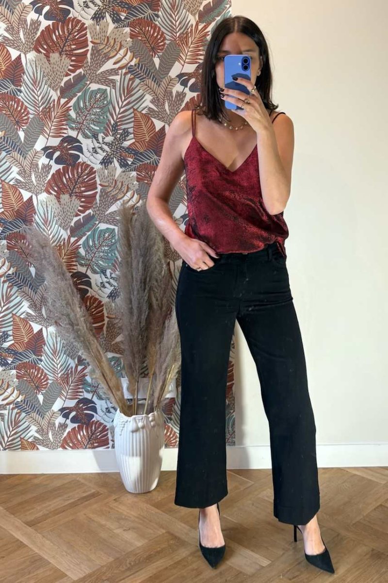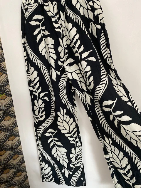 Ensemble composé d’ un pantalon taille élastique et d’ un top sans manches avec épaulettes et ceinture ,peut etre ceinturé devant ou dans le dos très fluide . Coupe palazzo