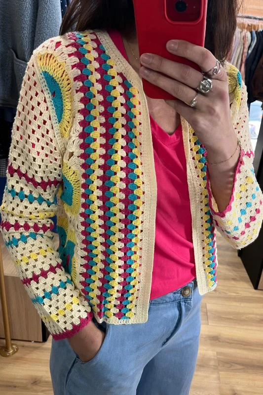 Adoptez un look bohème-chic avec ce gilet en crochet écru, réalisé dans un mélange confortable de 60% coton et 40% acrylique. Ses motifs délicats aux touches de bleu, jaune et rose apportent une note joyeuse et lumineuse à cette pièce pleine de caractère.
