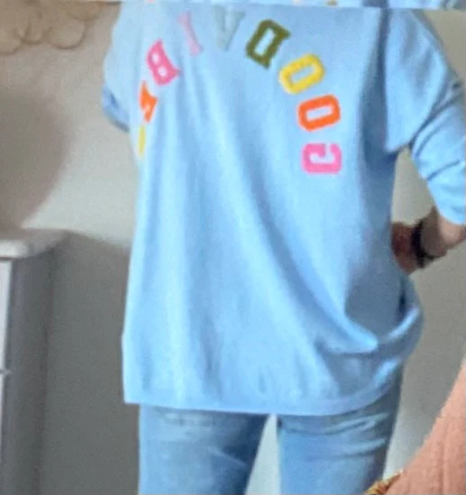 Gilet manches longues , se porte ouvert , avec inscriptions colorées au dos en pilou pilou . NOUVELLE COLLECTION PRINTEMPS ETE 50% VISCOSE 28% POLYESTERE 22% POLYAMIDE MADE IN ITALIE LONGUEUR 68 CM LARGEUR 72 CM