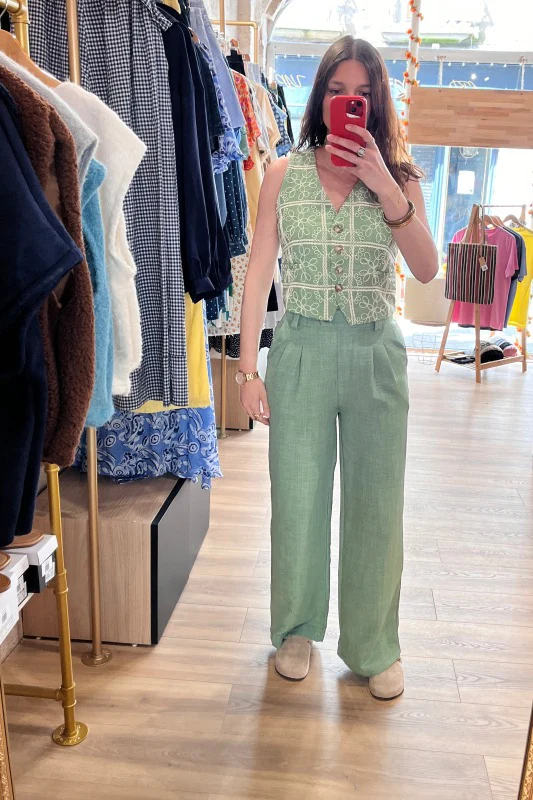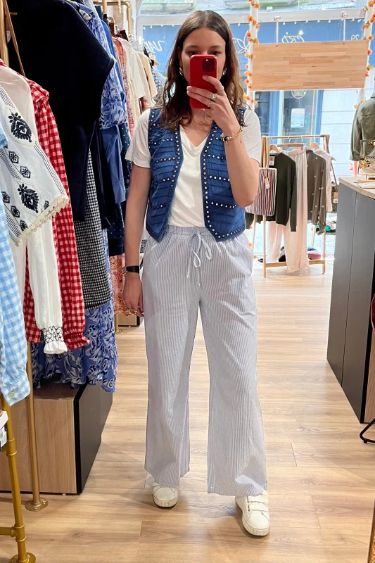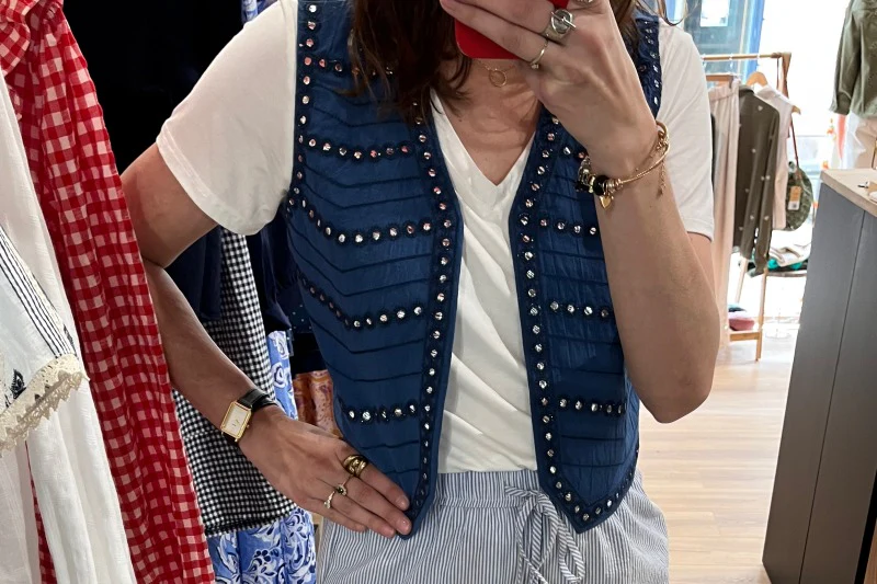Apportez une touche d’originalité élégante à votre look avec ce gilet sans manches bleu marine, confectionné en 100 % coton doux et respirant. Son design épuré est rehaussé par de petits ronds blancs à effet miroir, qui captent la lumière avec subtilité pour un rendu à la fois moderne et raffiné. Idéal à superposer sur une chemise, un top ou une robe, ce gilet complète parfaitement vos tenues du quotidien comme celles plus habillées.