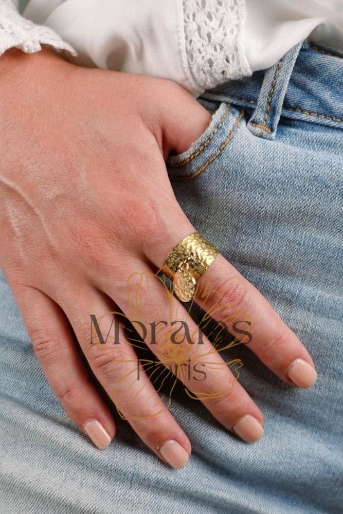 Habillant généralement le cou, le pendentif se réinvente et se décline sous la forme d’une bague, pour un bijou audacieux et original. On ne peut que succomber au charme de cette grande bague bohème ajustable en acier inoxydable doré et martelé. Un accessoire à porter en soirée pour souligner sa féminité.