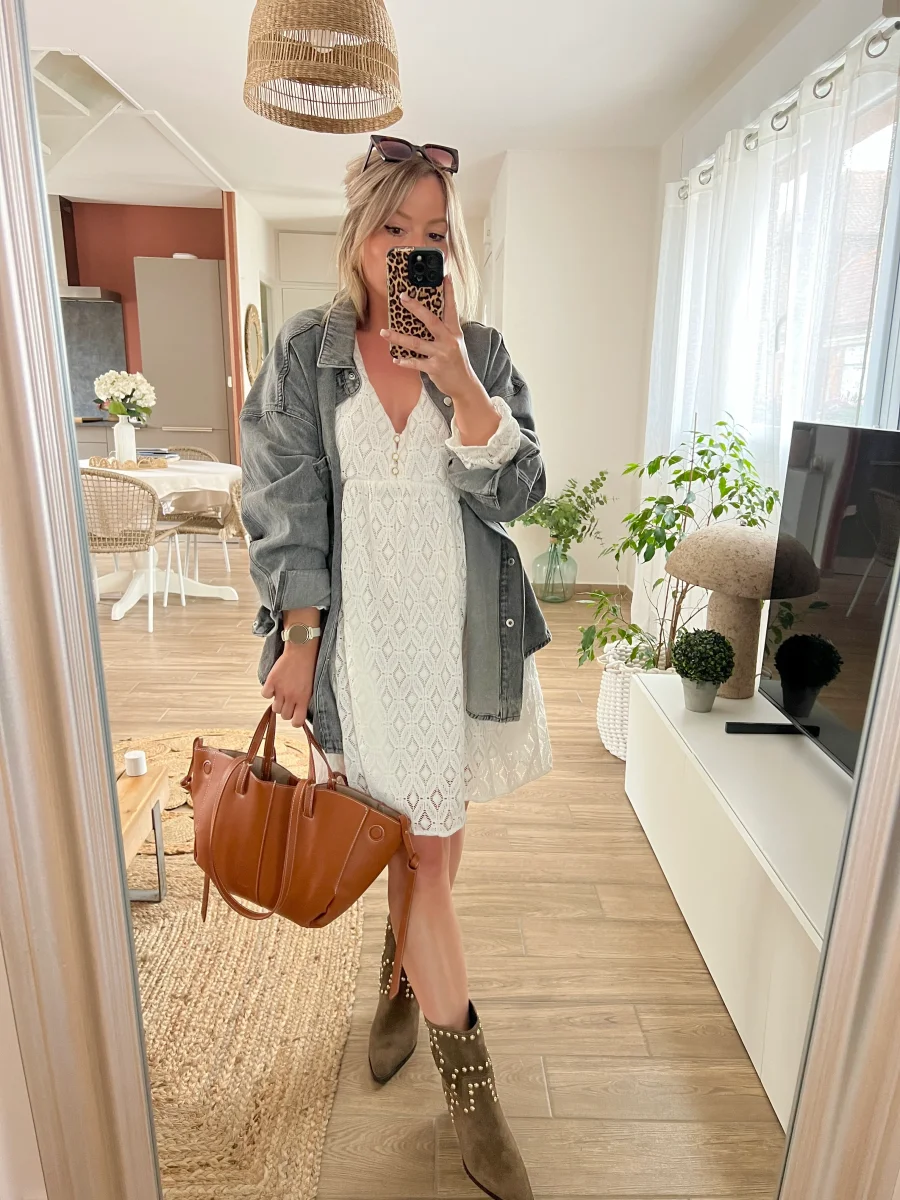 Robe col V, coupe vaporeuse Doublée Composition : 85% polyester, 15% coton Coloris : Blanc Tailles disponibles : du S au L. Prendre sa taille habituelle. Convient aux femmes enceintes & allaitantes. Pour rappel, le modèle mesure 1m60 Tous les articles qui composent les looks sont disponibles sur notre site internet. Les Avantages LilieShop : […]
