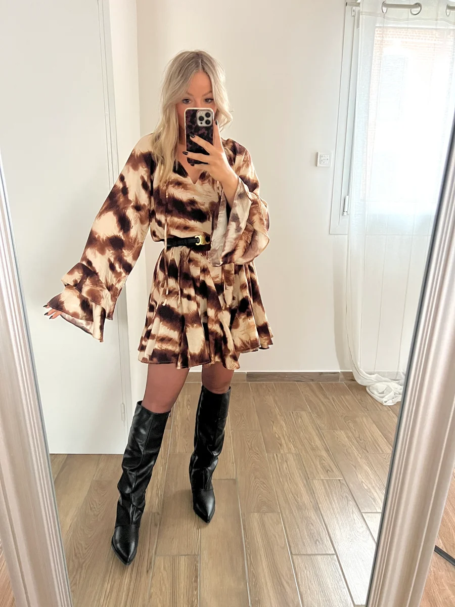 Robe coupe évasée avec manches trompettes Peut se porter ceinturer ou non Composition : 80% viscose, 20% polyamide Coloris disponibles : Dans les tons de beige et marron Tailles disponibles : S/M ou M/L. Prendre sa taille habituelle. Convient aux femmes enceintes. Pour rappel, le modèle mesure 1m60 Tous les articles qui composent les looks […]