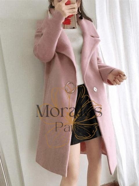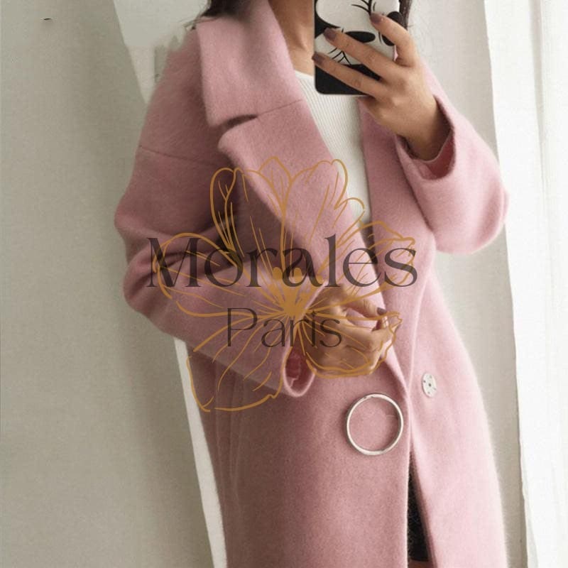Ce manteau bohème chic rose à mi-longueur s’affiche avec une coupe droite et sans aucune taille marquée. Très apprécié pour son style “Office Lady”, ce vêtement peut s’utiliser aussi bien en ville que pour le travail. Il a un grand col retourné qui se referme avec un bouton discret situé à la taille et souligné par une boucle argentée.