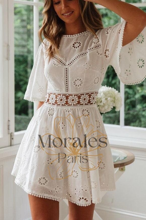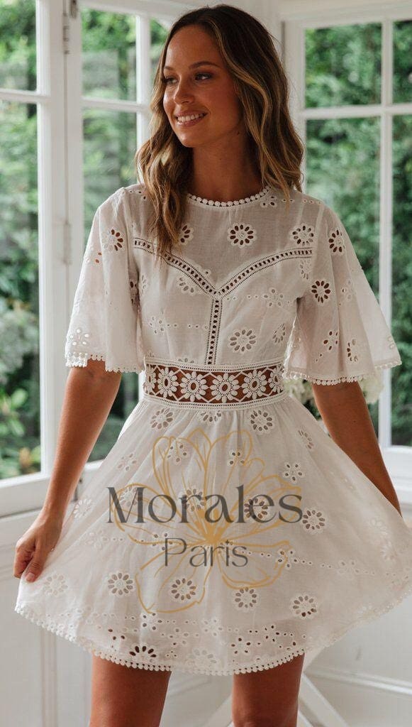Cette robe courte en dentelle blanche est faite pour un look bohème-chic. Avec son tissu léger et ses délicats détails en dentelle, cette robe est parfaite pour l’été. Appréciez le confort et le mouvement de cette robe, parfait pour une journée ou une soirée décontractée.