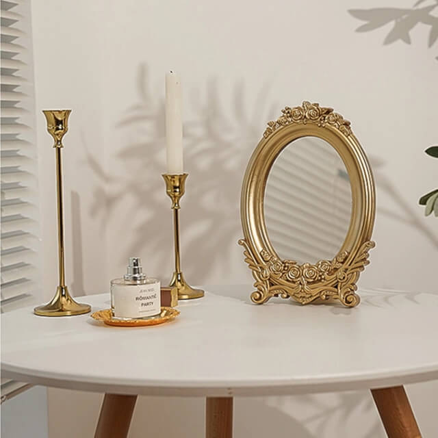 Fabriqué avec soin, notre miroir en résine robuste reste intact même en cas de chute. Que ce soit pour vos sessions de maquillage glamour ou simplement pour vous admirer, ce compagnon est prêt à rendre chaque moment spécial. Son esthétique tout en finesse et en charme saura séduire les amateurs de décorations raffinées.