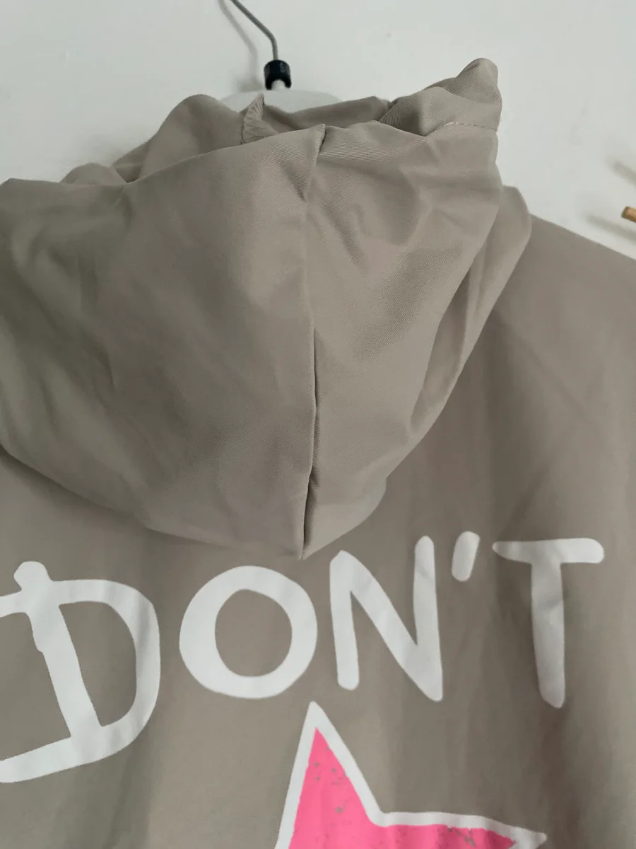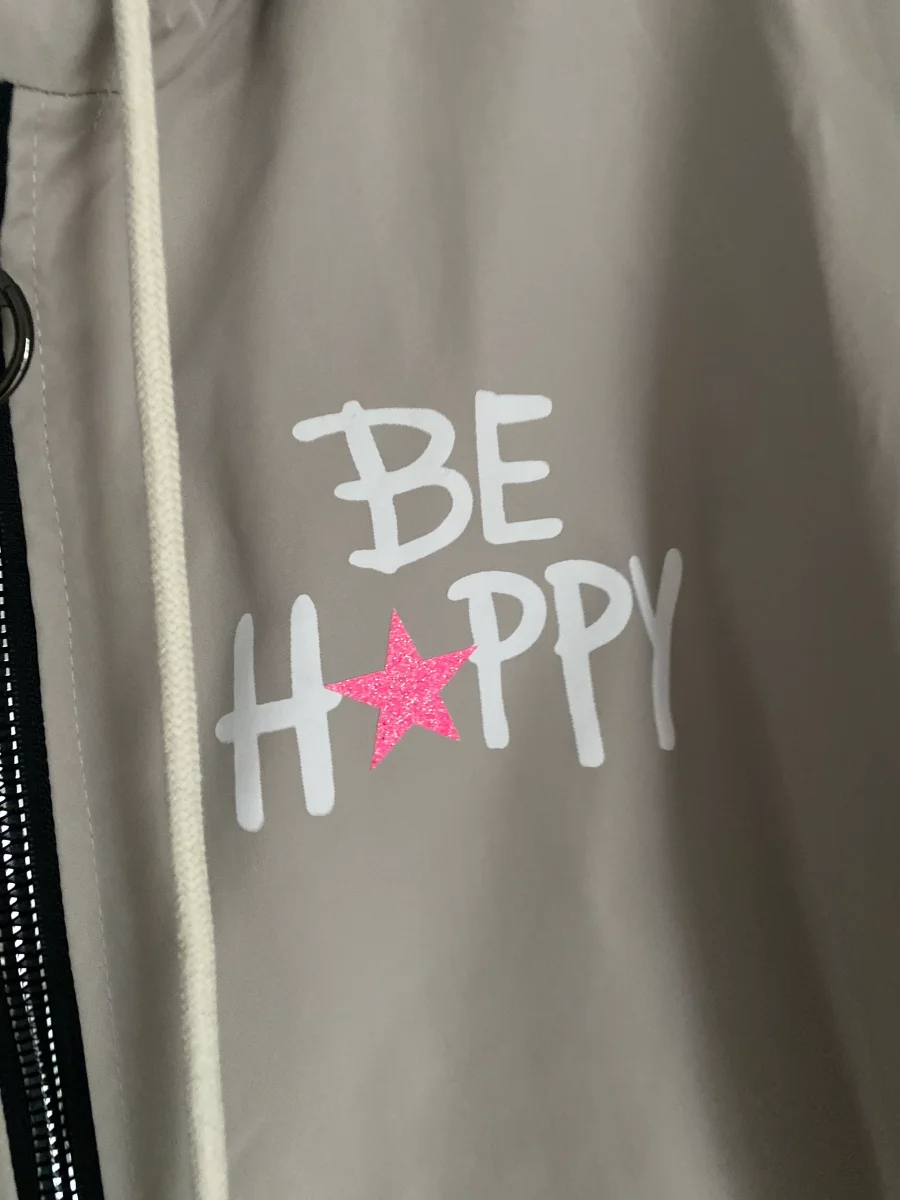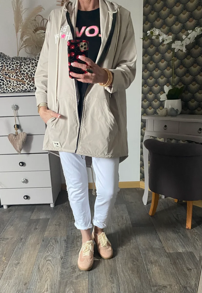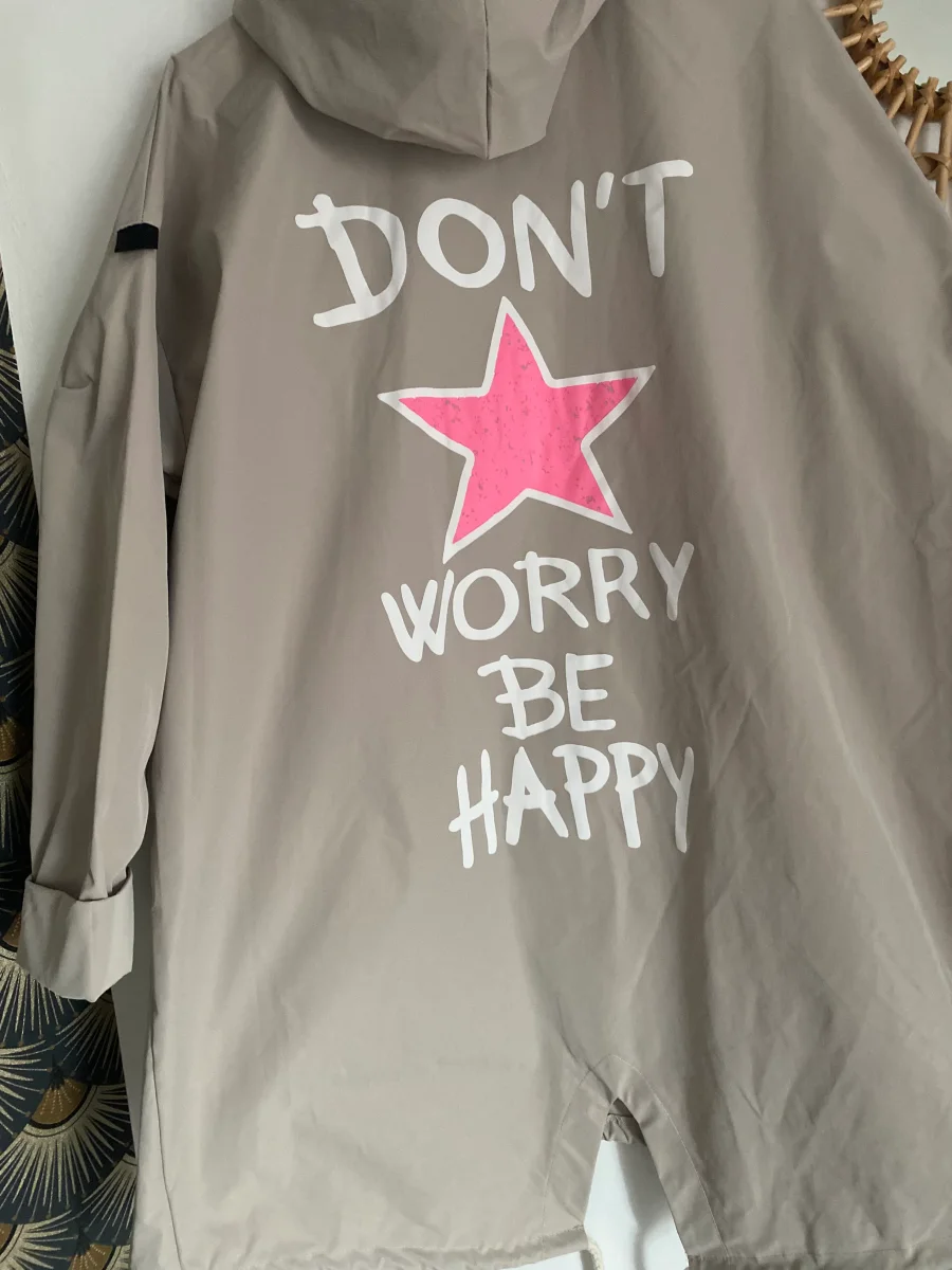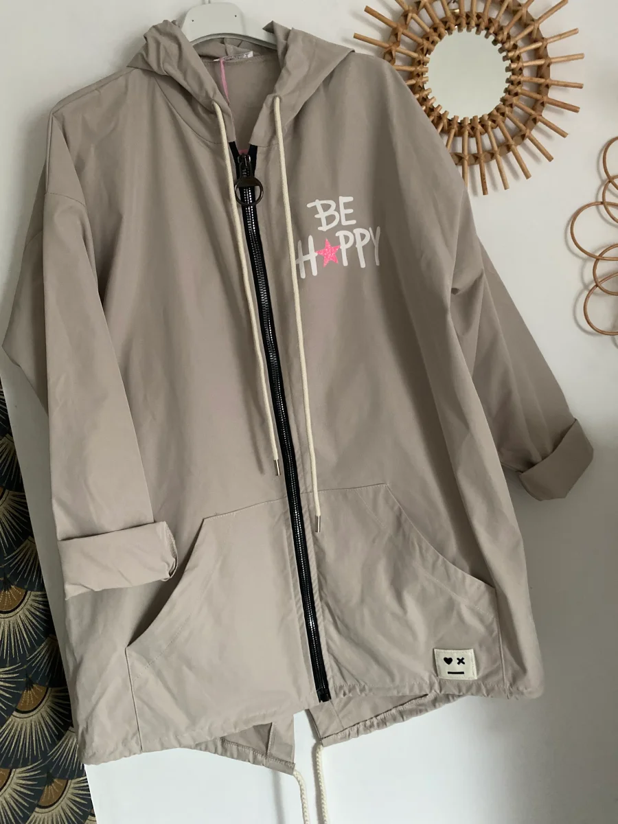 Veste parka pour le printemps , avec motifs dans le dos , fermeture par zip , deux poches avant , et capuche