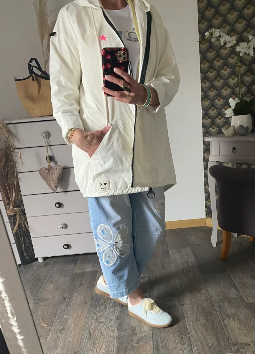 Veste parka pour le printemps , avec motifs dans le dos , fermeture par zip , deux poches avant , et capuche