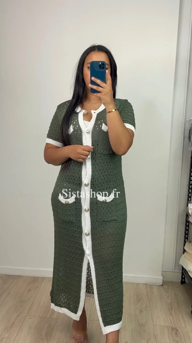 Robe à crochet avec petits boutons dorés. Transparente, elle se porte avec une sous-robe ou un maillot de bain pour être utilisée comme robe de plage, ou selon vos envies. À noter : le mannequin a ajouté une épingle au niveau des genoux pour fermer la robe