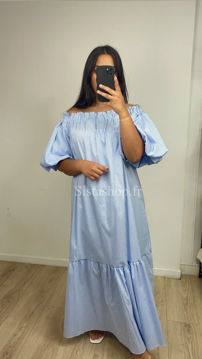 Robe longue fluide et évasée avec manches courtes ballon et col bateau. Le tissu léger offre confort et liberté de mouvement. Parfaite pour les journées chaudes et les occasions spéciales.