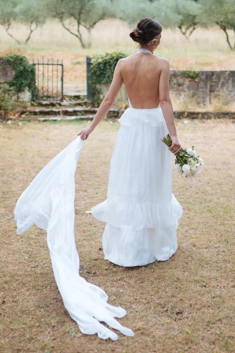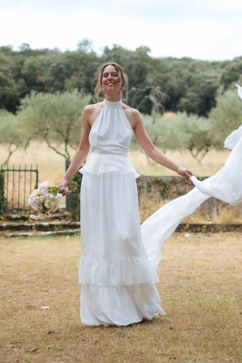 Robe de mariée moderne, épurée et légère, sans dentelle.Col américain boutonné, grand dos nu.Jupe longue droite avec jupons à volants en mousseline et ceinture en organza. Taille : 38Une seule pièce disponible. Pourquoi on l’aime ? Pour ses jupons amovibles pour un look 3-en-1.
