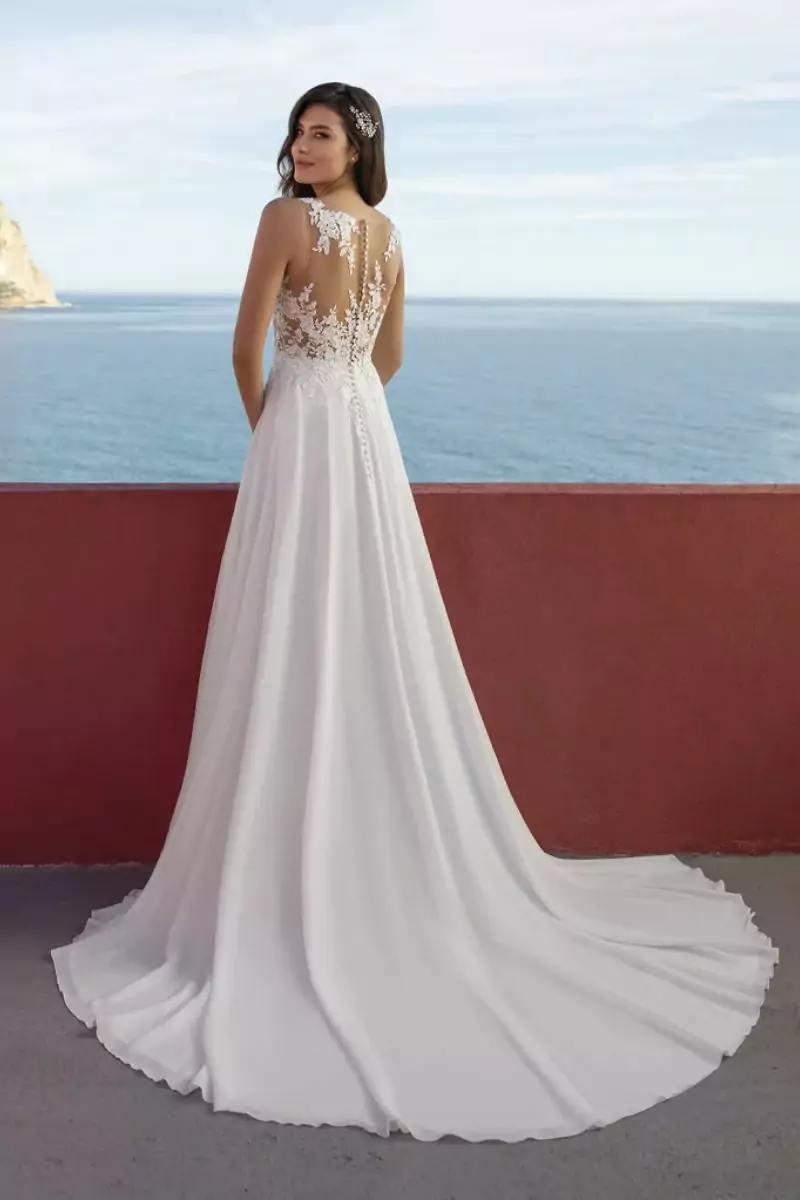 Robe de mariée chic et fendue.Bustier décolleté en tulle brodé de fleurs et perles, dos illusion boutonné.Jupe en georgette drapée et fluide, avec fente latérale. Taille : 36Une seule pièce disponible. Pourquoi on l’aime ? Pour sa dentelle qui descend en cascade sur la taille.