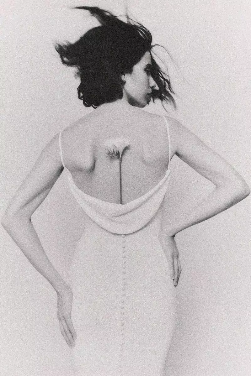 Décolleté V, dos nu inversé et petites manches en tulle brodé de Caudry réhaussé de perles et paillettes.