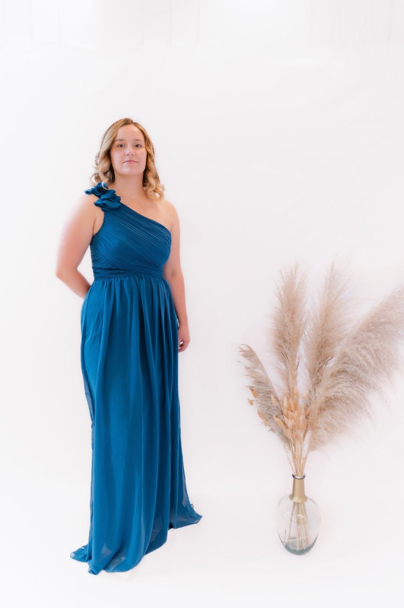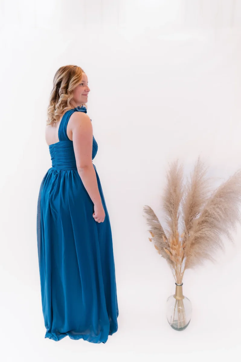 Robe longue unie – Modèle déposé – Manche Asymétrique sur le coté droit – Joli petit volant – Drapé niveau poitrine – Cintrée – Dos fermé – Tirette à l’arrière – Doublure – Matière fluide et agréable