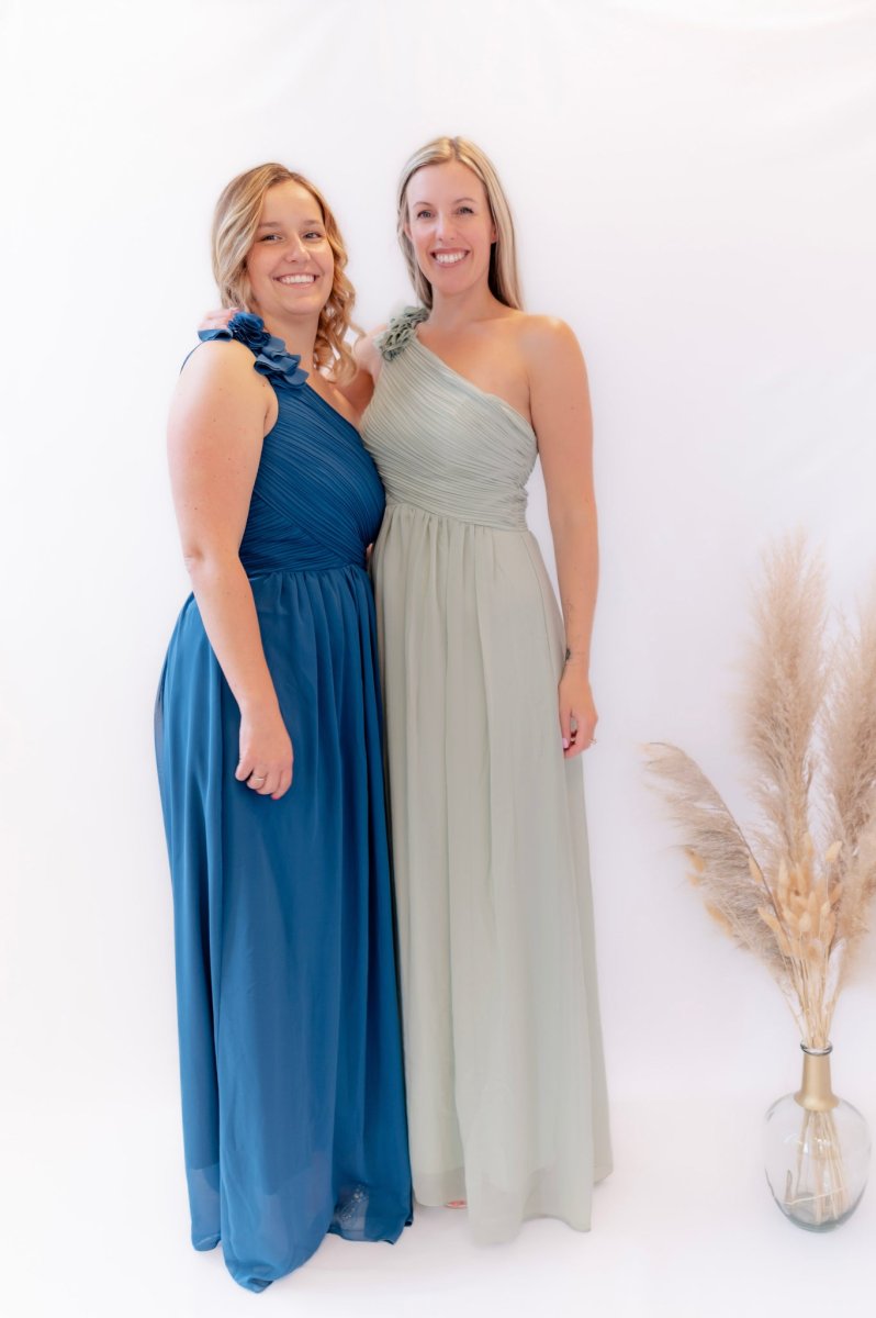 • Le modèle portant la robe Bleu canard porte une taille L/XL