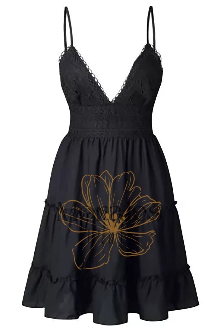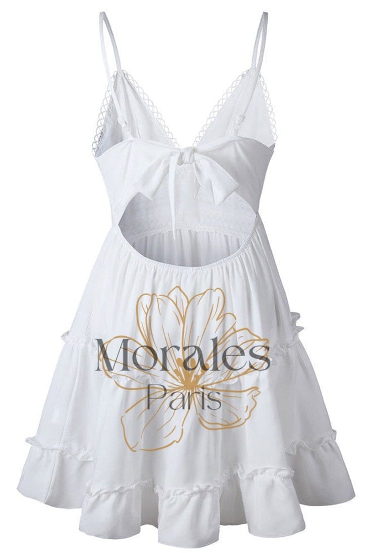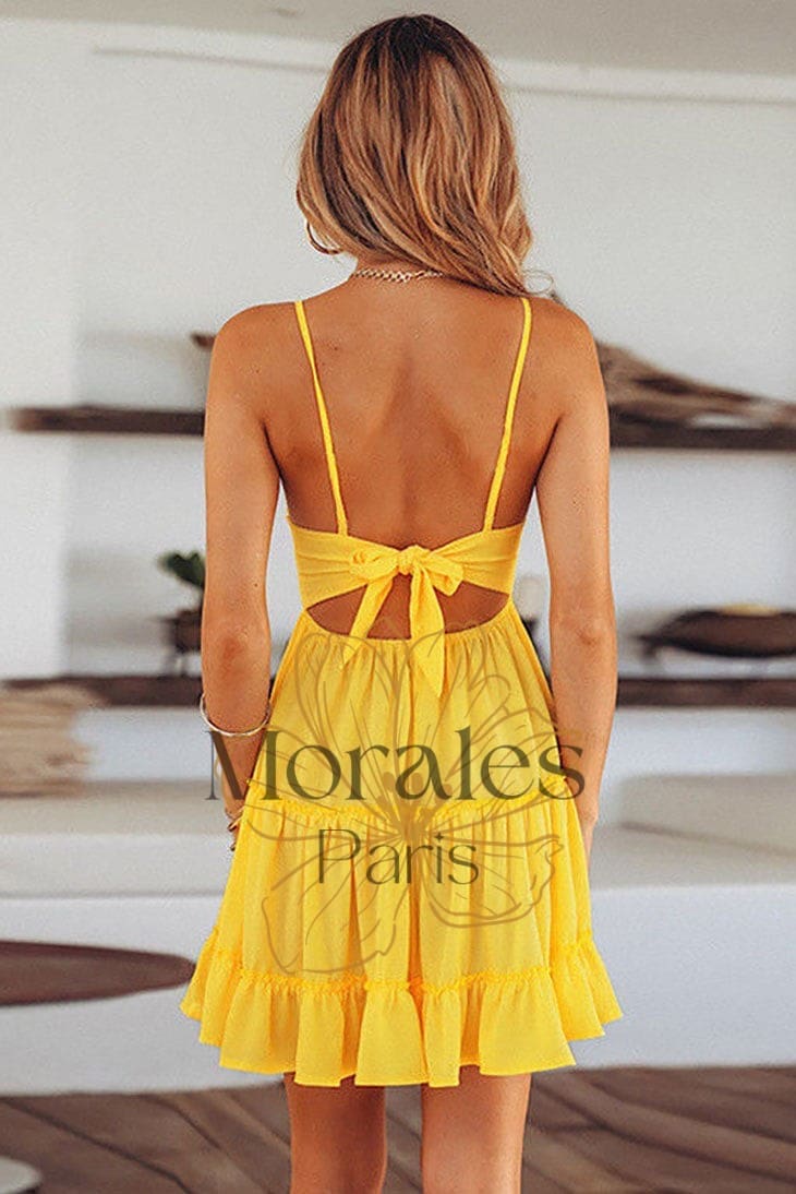 - Détails : courte | dos nu | épaules dénudées | à volants | taille ajustée