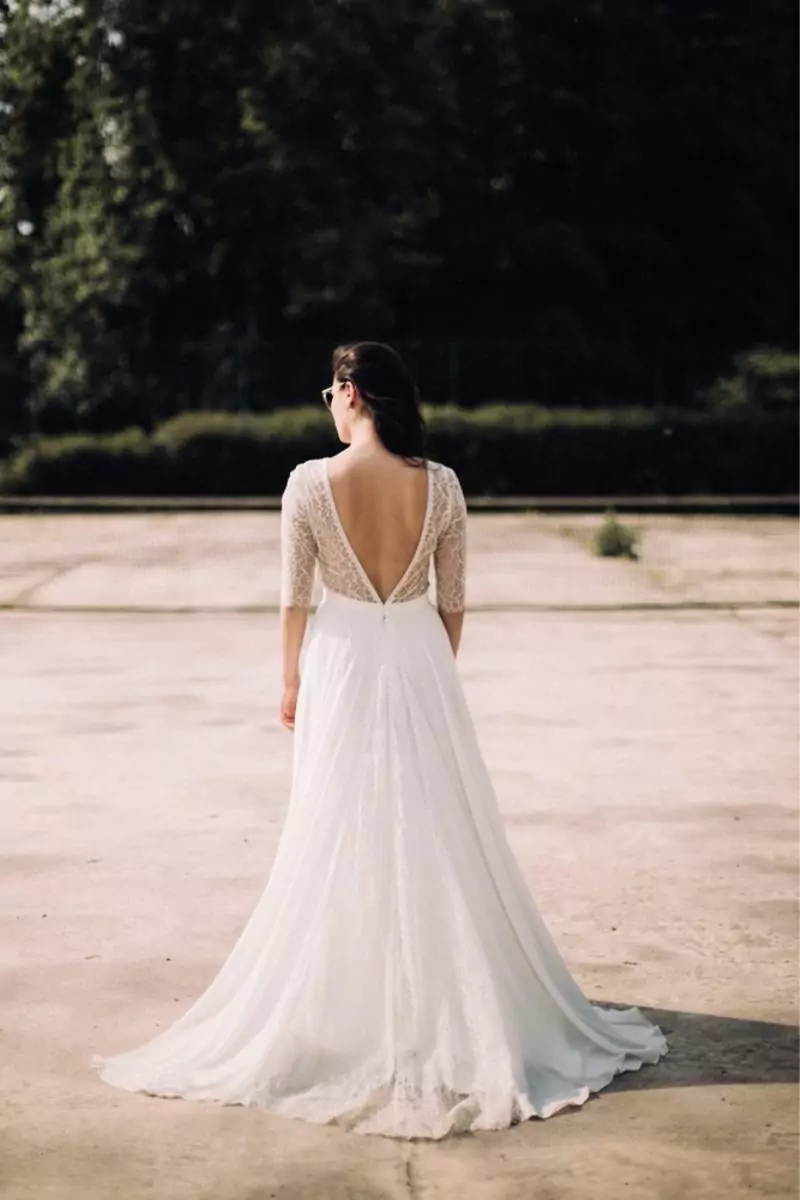 Robe de mariée chic, fluide et confortable.Col bateau, manches trois quart en dentelle Chantilly, brodée d’un galon de guipure.Dos nu V, taille marquée.Jupe longue évasée en georgette de soie, avec quille de dentelle. Taille : 38Une seule pièce disponible. Pourquoi on l’aime ? Pour son savant mélange de lignes modernes et matières nobles traditionnelles.