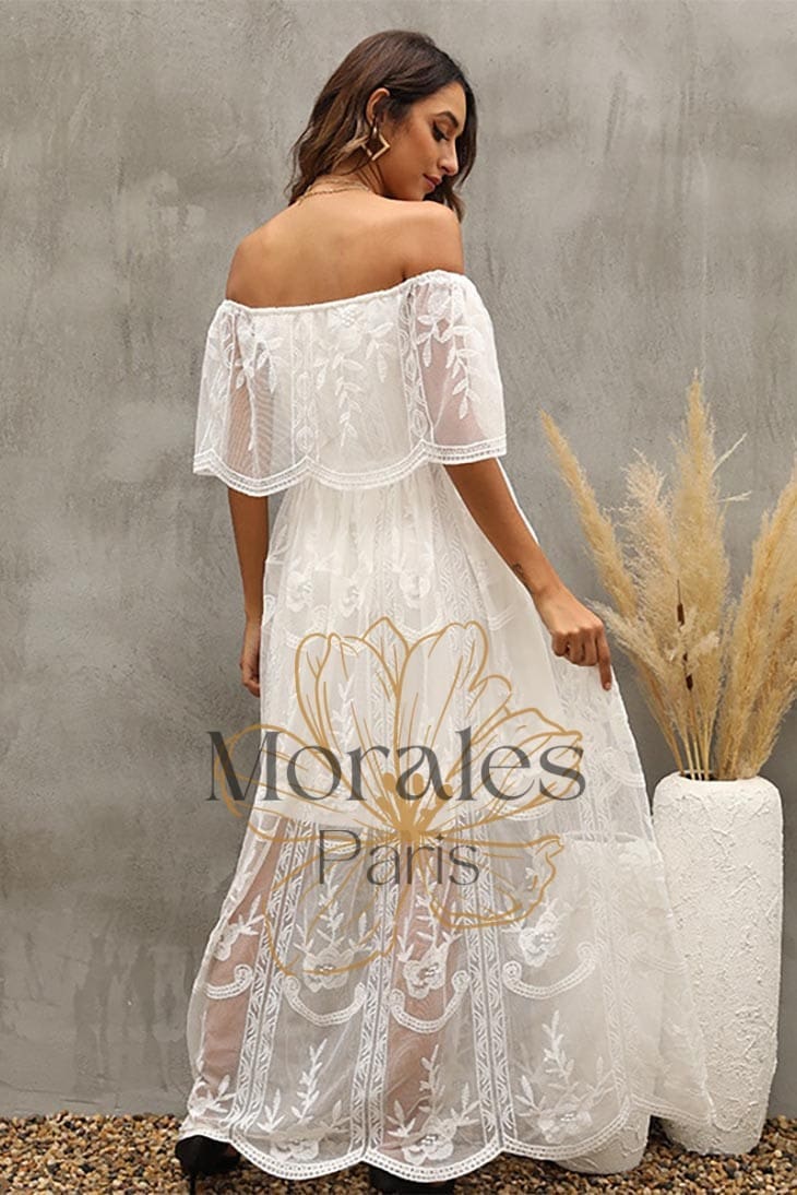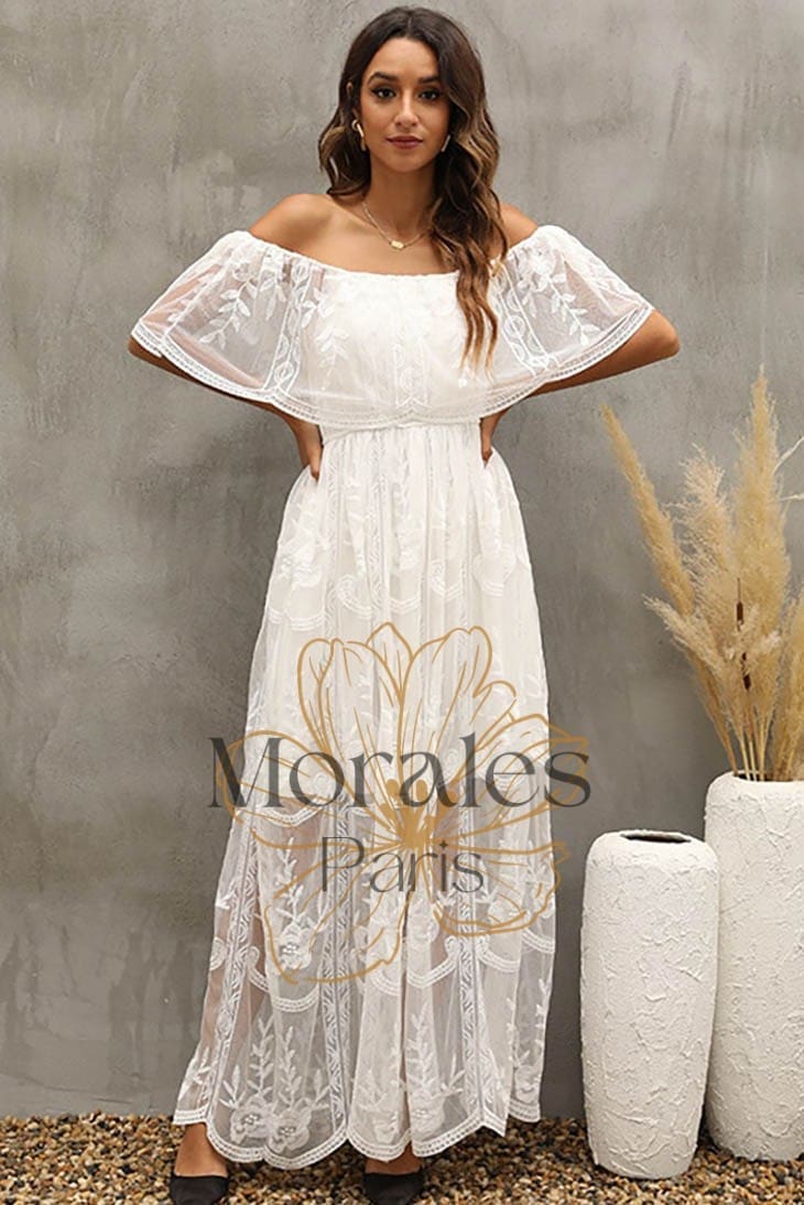N’hésitez plus et tombez sous le charme de notre Robe Bohème Blanche à Col Bardot – vous ne le regretterez pas !