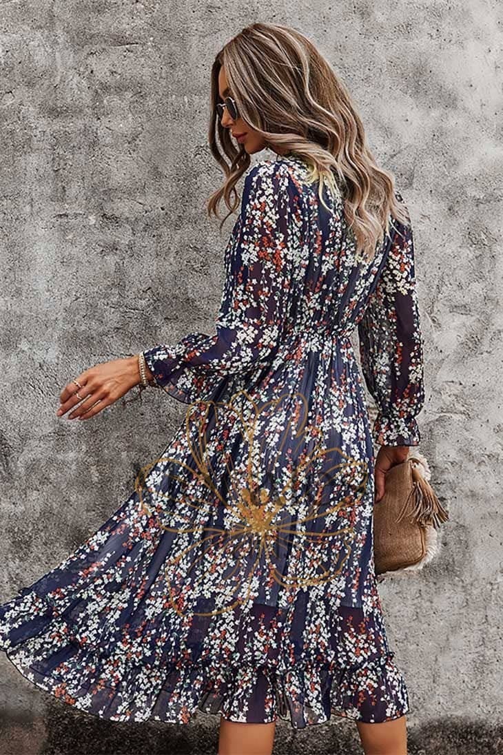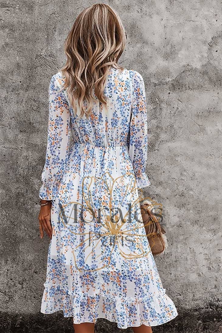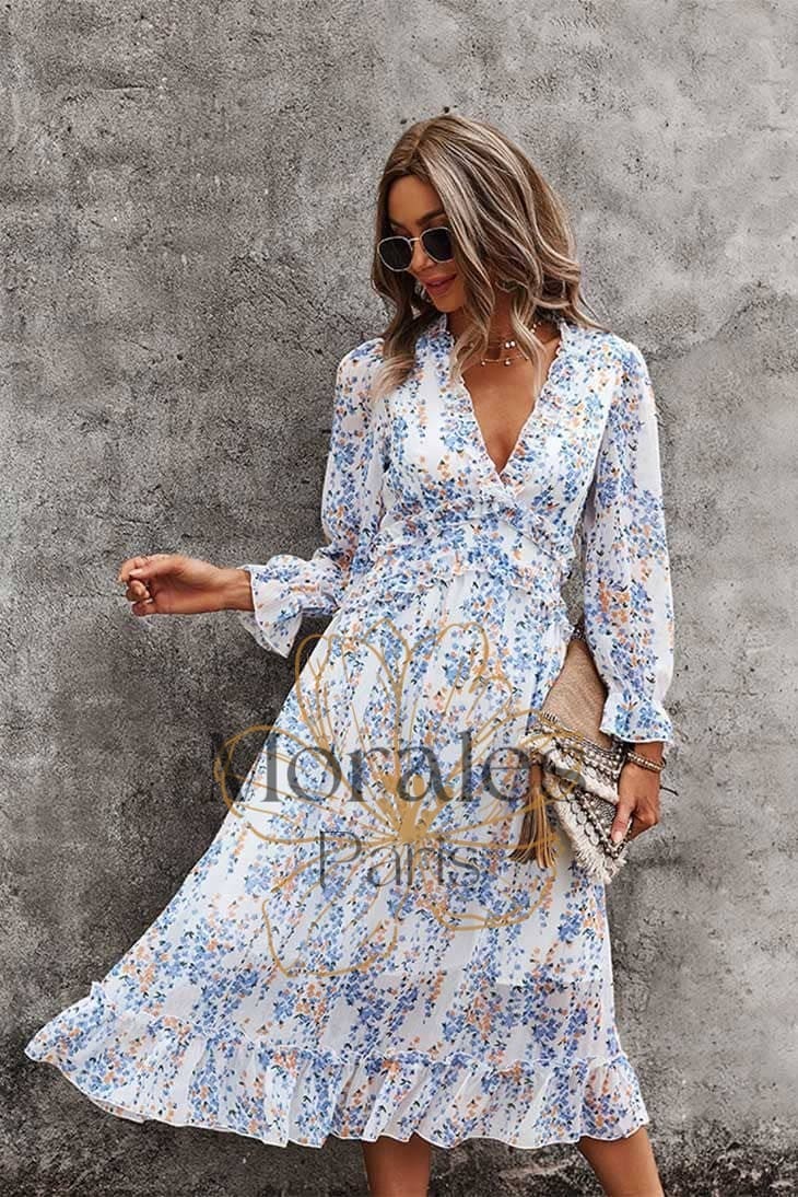 Vous recherchez une robe idéale pour cet automne ? La robe blanche imprimée de jolies fleurs bleues et roses présentant un col en V flatteur et des manches longues est faite pour vous. C’est le choix parfait pour un mariage d’automne ou une journée à la campagne. Associez-la à des bottines et à un chapeau à large bord pour un look bohème chic.