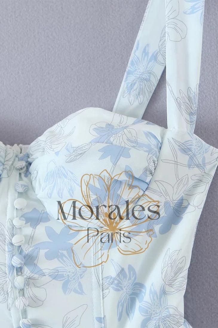 - Détails : dos nu | bustier à boutons | épaules découvertes | fendue | taille ajustée