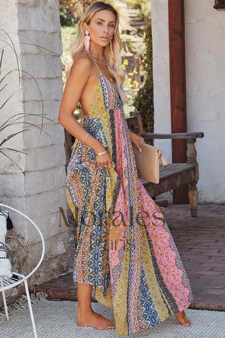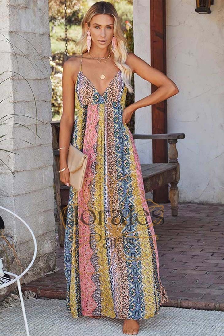 Cette magnifique robe présente un décolleté plongeant et des bretelles fines qui mettent en valeur votre silhouette féminine. Les couleurs vives et les motifs floraux ethniques ne manqueront pas de faire tourner les têtes où que vous alliez. Parfaite pour une journée ou une soirée d’été, cette robe colorée vous donnera l’impression d’être une déesse !