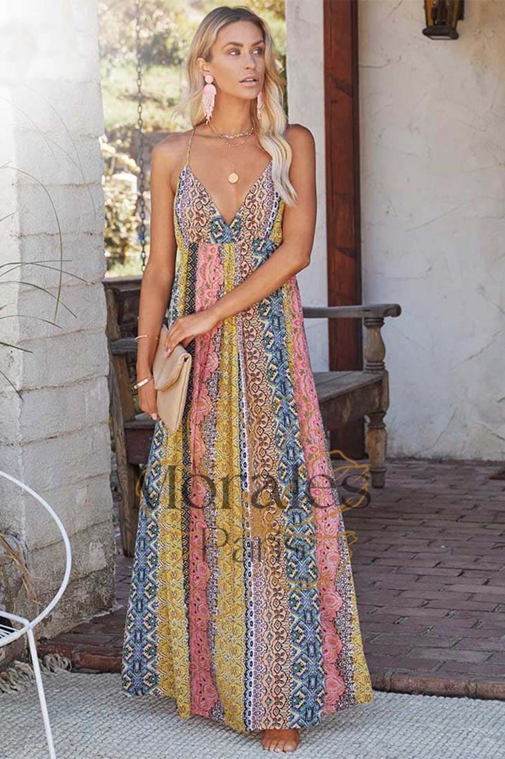 Cette splendide robe présente un décolleté plongeant et des fines bretelles qui mettent votre silhouette féminine en valeur. Les couleurs vives et les motifs floraux ethniques seront certainement un véritable succès partout où vous irez. Idéale pour une journée ou une soirée d’été, cette robe multicolore vous donnera l’impression d’être une déesse !